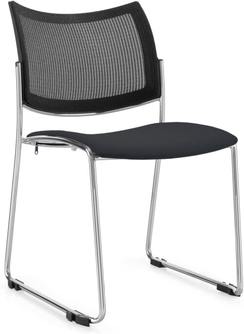 Product Features Dimension (mm): W505 x D565 x H820 Sled Base Mesh back Upholstered fabric seat Chrome frame Stackable Max.